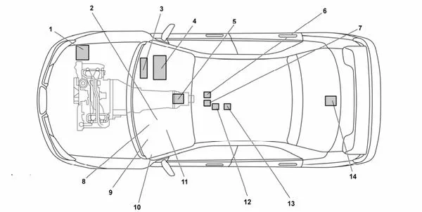 DCCD. 1 - электронный блок управления ABS, 2 - датчик положения рулевого колеса, 3 - электронный блок управления DCCD, 4 - электронный блок управления двигателем, 5 - межосевой дифференциал, 6 - переключатель "AUTO MANU" режимов работы DCCD, 7 - управляющий переключатель DCCD, 8 - датчик положения дроссельной заслонки, 9 - выключатель стоп-сигналов, 10 - реле DCCD, 11 - блок индикаторов DCCD, 12 - датчик замедления и бокового перемещения автомобиля, 13 -датчик включения стояночного тормоза, 14 - датчик температуры масла в заднем редукторе. |