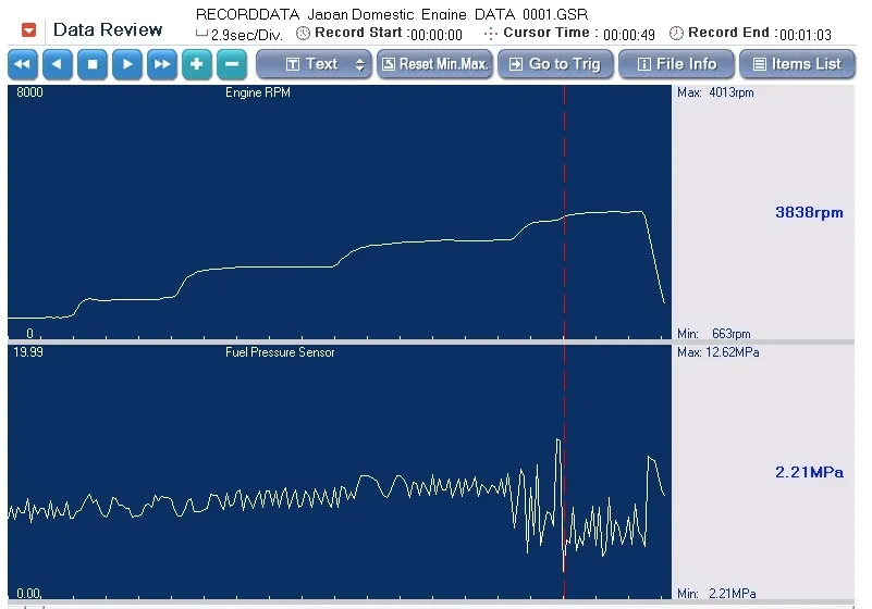 Даю пояснения, хотя все и так видно. Это запись определенного временнОго участка, на котором отображены изменения оборотов двигателя и соответственно изменение давления ТНВД. У каждого графика есть значения min/ max. А синим цветом значения в тех точках, куда установлен маркер. Проблема простая, на высоких оборотах, мотор «валится» динамика пропадает. На средних и в низах нормально. Анализируем.