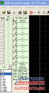Под этой кнопкой, которой осуществляется масштабирование, есть значение разверток. При записанном файле их все посмотреть нельзя. Если мы масштабируем уже записанное изображение, время развертки ставится «по умолчанию» для каждого значения масштаба. То есть: «когда хотите увидеть сигнал, то перед тем как подключиться к цепи, сначала выставьте те значения, которые будут необходимы при просмотре». Если, посмотрев сигнал, вы решаете рассмотреть его подробнее - используйте органы управления и делайте так, что бы могли видеть то, что хотите увидеть. Все эти возможности у осциллографа автомобильного есть. Просто напомню: используйте режимы триггера. Если они есть в вашем приборе, картинка всегда будет идти с того места, которое вы зададите.