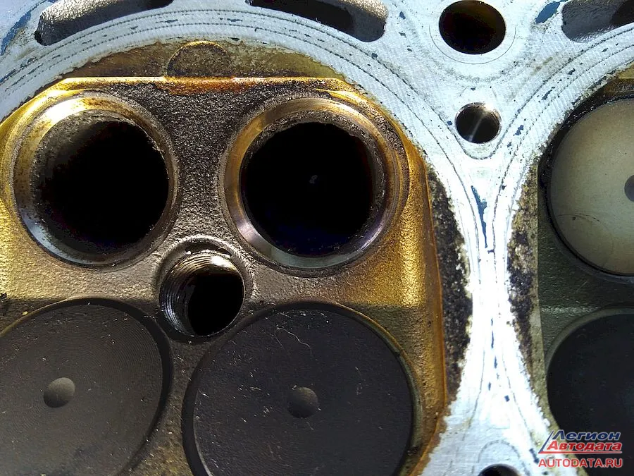 Сняли головку блока, вынув выпускные клапана проблемного цилиндра, увидели нарушение рабочей фаски седла клапана со смещением на сторону и увеличенное биение клапана в направляющей втулке.