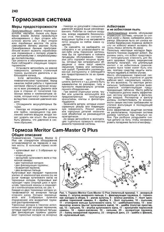 Издание содержит руководство по эксплуатации, описание систем, сведения по техническому обслуживанию, ремонту некоторых систем двигателей (в т.ч. дополнительного масляного фильтра, системы облегчения холодного пуска (эфир), моторного тормоза, опор двигателя, радиатора системы охлаждения, систем впуска и выпуска), элементов управления механической коробки передач, переднего и заднего редукторов, тормозной системы (в т.ч. элементов антиблокировочной системой тормозов (ABS) Meritor Wabco, Rockwell Wabco, Eaton, Bendix, противобуксовочной системы ATC), рулевого управления и подвески, кузовных элементов, рамы, системы кондиционирования и вентиляции, системы пассивной безопасности (SRS).