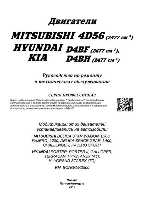 Купить книгу по ремонту и эксплуатации двигателей Mitsubishi 4D56, 4D56EFI, 4D56DI-D, устанавливались на Mitsubishi Delica, Star Wagon, L300, Pajero, L200, Delica Space Gear, L400, Challenger, Pajero Sport и двигатели Hyundai и Kia D4BF, D4BH TCI, Covec-F устанавливались на Hyundai Porter, Porter 2, Galloper, Terracan, H-1 Starex, Grand Starex, Kia Bongo, K2500, электросхемы Вы можете в нашем интернет-магазине с доставкой Почтой России или курьером по Москве.