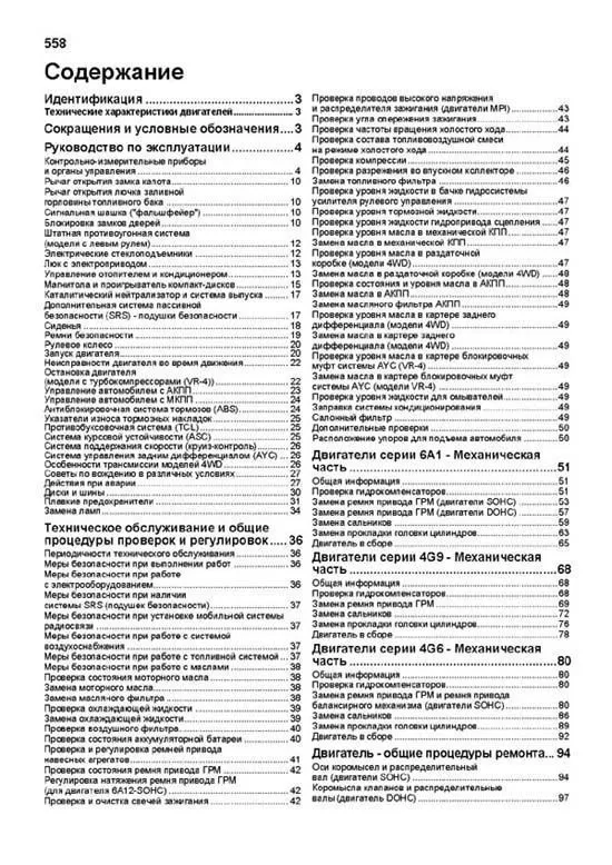 Руководство по ремонту Mitsubichi Galant / Legnum / Aspire с левосторонним и правосторонним рулевым управлением 1996-2005 гг. выпуска, оборудованных бензиновыми двигателями GDI 4G93 (1,8 л), 4G94 (2,0 л), 4G64 (2,4 л) и бензиновыми двигателями MPI 4G63 (2,0 л), 4G64 (2,4 л), 6A12 (V6 2,0 л) и 6A13 (V6 2,5 л).