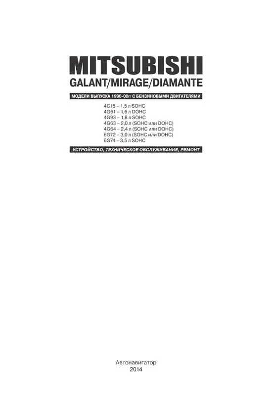 Книга Митсубиси Галант, Диамант 1990-2000 с бензиновыми двигателями 1.5, 1.6, 1.8, 2.0, 2.4, 3.0, 3.5 двигателями. Руководсво по ремонту, устройству, эксплуатации и техническому обслуживанию автомобиля.
