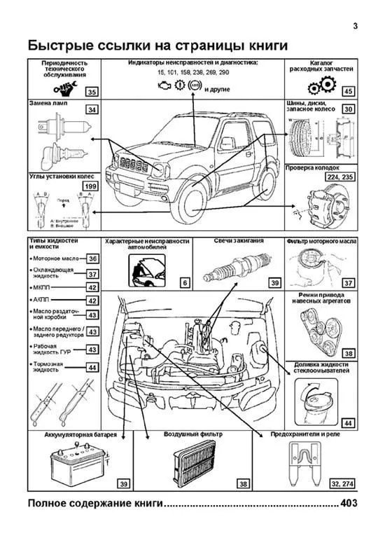 каталожные номера расходных запчастей, необходимых для технического обслуживания, размеры рекомендуемых и допускаемых к установке шин и дисков. Представленные характерные неисправности моделей Suzuki Jimny и способы их устранения помогут вам при эксплуатации автомобиля.