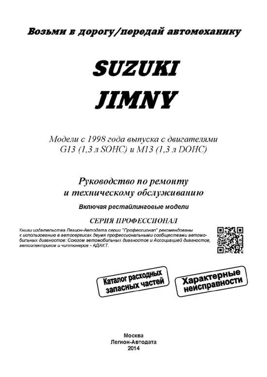Книга Сузуки Джимни 1998-2019 с двигателями G13 1.3 SOHC и М13 1.3 DOHC. Включая рестайлинговые модели. Каталог расходных запчастей, электросхемы, характерные неисправности, диагностика. Руководство по ремонту и техническому обслуживанию автомобиля. Серия Профессионал.