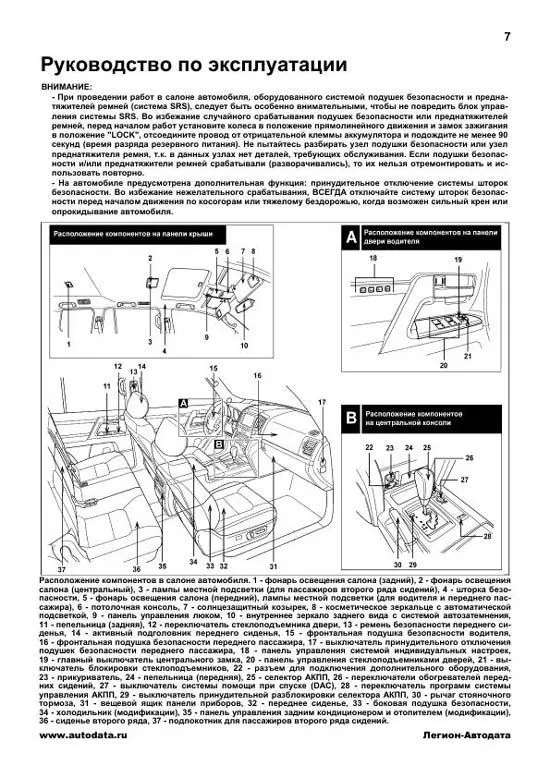 Издание содержит руководство по эксплуатации, описание систем, подробные сведения по техническому обслуживанию автомобиля; диагностике, ремонту и регулировке некоторых элементов систем двигателя (в. т.ч. систем впрыска бензиновых двигателей, топливной системы Common Rail дизельного двигателя, зажигания, запуска и зарядки), рекомендации по регулировке и ремонту элементов автоматических коробок передач, раздаточной коробки, заднего и переднего редукторов, тормозной системы (включая антиблокировочную систему тормозов (ABS), систему экстренного торможения (ВА), активную противобуксовочную систему (A-TRC), систему курсовой устойчивости (VSC), систему помощи при спуске (DAC), систему помощи при трогании на подъеме (НАС), систему помощи при езде по бездорожью (CRAWL)), рулевого управления (включая систему изменения передаточного отношения рулевого управления (VGRS)) и подвески (включая систему стабилизации положения кузова (KDSS), активную систему управления высотой расположения кузова (АНС) и систему изменения жесткости амортизаторов (AVS)).