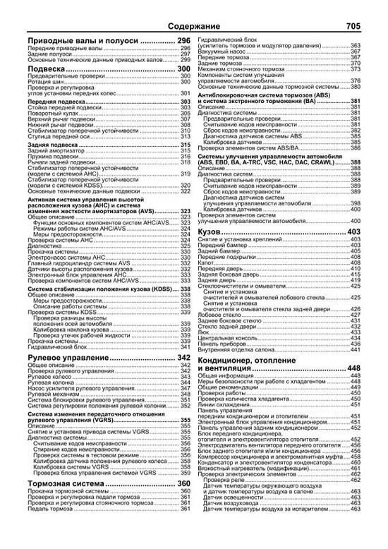 Издание содержит руководство по эксплуатации, описание систем, подробные сведения по техническому обслуживанию автомобиля; диагностике, ремонту и регулировке элементов систем двигателя (в. т.ч. топливной системы Common Rail, турбонаддува, запуска и зарядки), автоматической коробки передач (АКПП), раздаточной коробки, заднего и переднего редукторов, тормозной системы (включая антиблокировочную систему тормозов (ABS), систему экстренного торможения (ВА), активную противобуксовочную систему (A-TRC), систему курсовой устойчивости (VSC), систему помощи при спуске (DAC), систему помощи при трогании на подъеме (НАС), систему помощи при езде по бездорожью (CRAWL)), рулевого управления (включая систему изменения передаточного отношения рулевого управления (VGRS)) и подвески (включая систему стабилизации положения кузова (KDSS), активную систему управления высотой расположения кузова (АНС) и систему изменения жесткости амортизаторов (AVS)), кузовных элементов, кондиционирования и вентиляции (АС), системы пассивной безопасности (SRS).