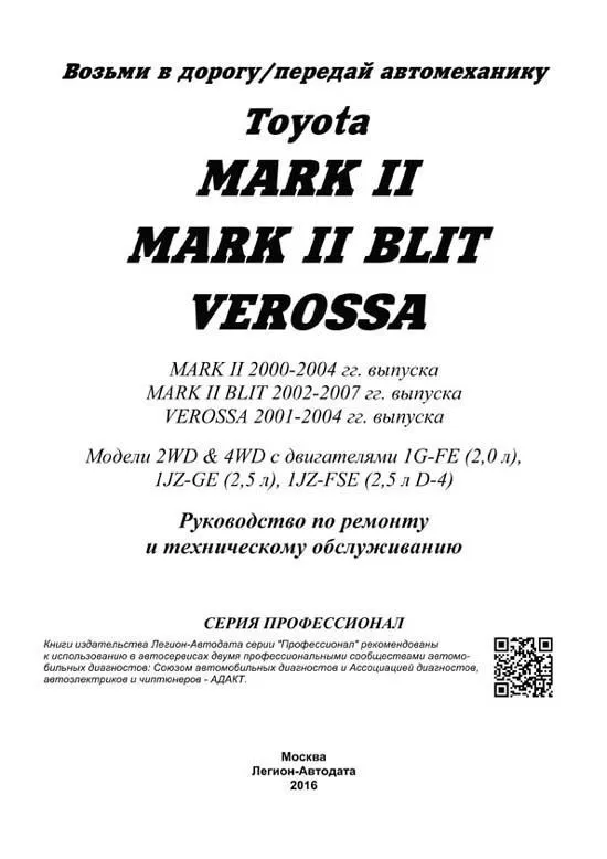 Купить книгу по ремонту и эксплуатации автомобиля Toyota Mark 2 2000-2004, Mark 2 Blit 2002-2007, Verossa 2001-2004 с бензиновыми двигателями 1G-FE 2.0, 1JZ-GE 2.5, 1JZ-FSE 2.5 D-4, электросхемы Вы можете в нашем интернет-магазине с доставкой Почтой России или курьером по Москве.