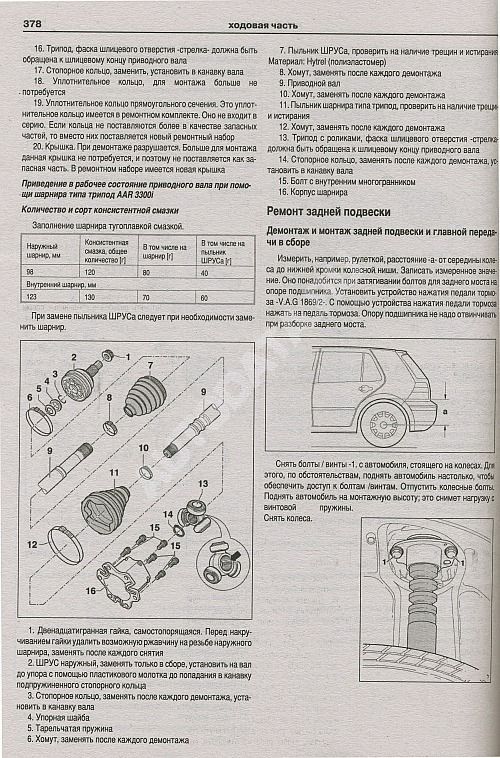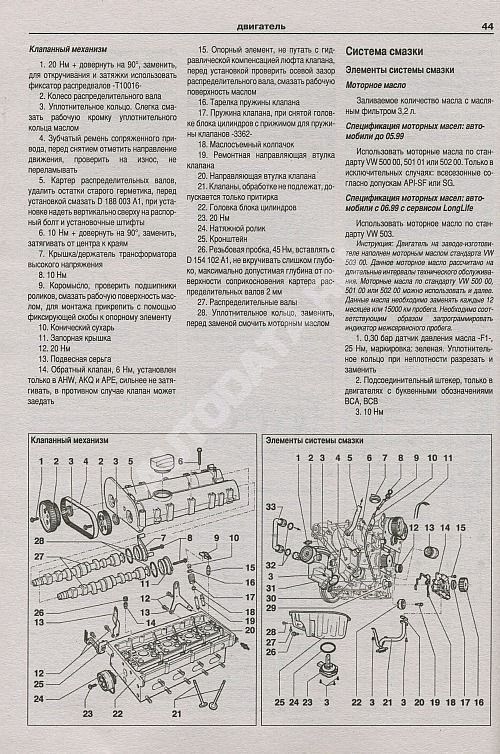 В каждой главе изложены подробные пошаговые инструкции по проверке, ремонту или замене элементов таких систем, как: механической части двигателя (включая замену приводных ремней, ГРМ, ремонта головки блока цилиндров и т.п.), топливной системы, систем смазки, охлаждения, впрыска топлива, зажигания, впуска и выпуска, механической (02K/02M/02Y) и автоматической (01M) коробок передач, сцепления, приводных валов, системы полного привода, рулевого управления, подвески, элементов тормозной системы (включая антиблокировочную систему тормозов (ABS) и систему курсовой устойчивости (ESP)), систем кондиционирования и вентиляции воздуха, кузовных элементов, электрооборудования двигателя и кузова автомобиля, а также коммуникационных систем ().