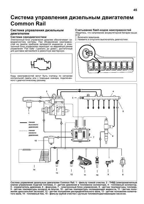 Приведены инструкции по диагностике электронной системы управления дизельным двигателем Common Rail. Подробно описаны коды неисправностей электронной системы управления двигателем. Представлены подробные электросхемы систем управления двигателем, запуска и зарядки.