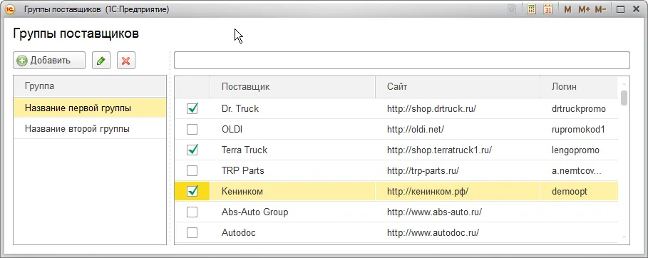 У Вас откроется окно "Группы поставщиков". Для добавления группы нажмите кнопку "Добавить". Затем впишите название группы и в правом окошке поставьте флажки напротив тех поставщиков, которых Вы хотите видеть в этой группе. После этого просто закройте окно.