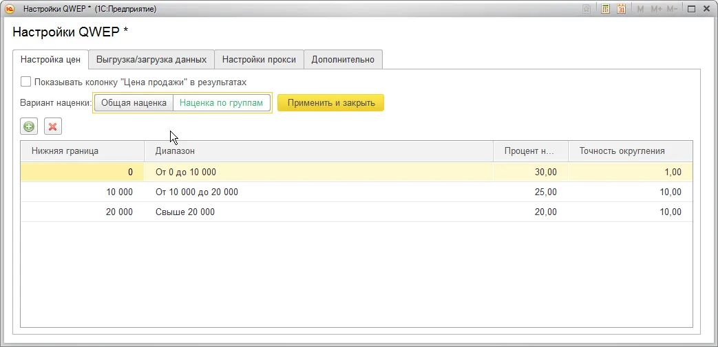 Есть два варианта наценки: общая наценка и наценка по группам. Общая наценка предполагает, что процент наценки будет один и тот же для всех категорий цен. Наценка по группам позволяет назначить процент наценки для каждой ценовой категории по отдельности, т.е. для позиций с ценой от 100 до 1000 рублей процент будет один, а для позиций с ценой от 1000 до 10000 другой.